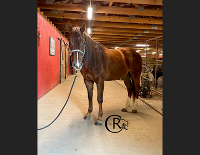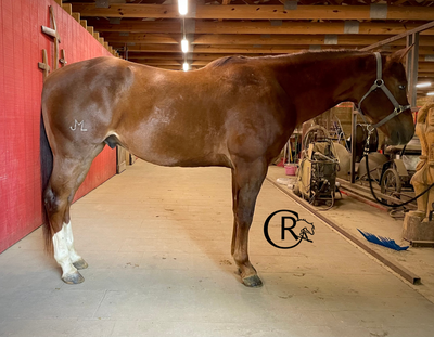 "Fire" is a 2021 chestnut gelding, standing about 15.1 hands, by Firewater Frenchman, son of the legendary Firewater Flit, and out of PC Frenchmans Lisbet—full sister to the one and only Bozo.